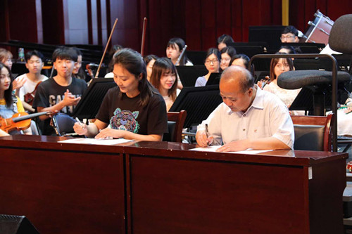挂牌仪式前,徐戈主任一行看望了在我校排练的武音管弦系学生,并和艺术学院党委书记进行了合作协议的签订,仪式由艺术学院副院长欧阳时来主持。