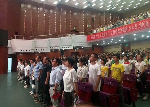 大会在雄壮的国歌声中拉开序幕。陈春生发表热情洋溢的讲话,深情寄语新生。陈春生说,大学是一个崭新的开始,同学们一定要学会自我管理,完善自我,超越自我,意识到自己肩负的责任,把个人的发展与民族的前途命运紧密联系在一起,珍惜时间,发奋学习。陈春生将郭沫若的诗句“我是一条天狗,我把月来吞,我把日来吞,把一切的星球来吞,把全宇宙来吞”赠予新生,希望同学们借助九江学院这一方舞台,书写出年轻人的豪迈与自信。