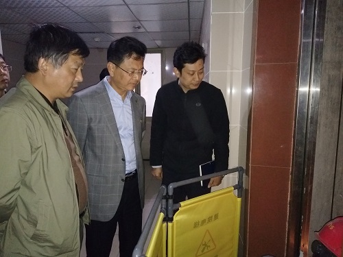 在学校“不忘初心、牢记使命”主题教育之际,学校领导深切关心教职工切身利益,2019年11月21日下午,校长刘晓东,副校长夏启国、陈小林带领党院办、工会、国资处、后勤处、保卫处、基建处等相关部门负责人和匡庐苑小区业主委员会代表、匡庐苑物业公司经理,深入教职工宿舍区——匡庐苑小区现场办公,检查电梯维修工作。