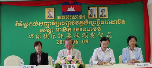 方侨生董事长(Pu Khear Se)在颁奖仪式中致辞,他指出,中国政府推行的“一带一路”政策将惠及柬埔寨的发展。纵观柬埔寨和加华银行的发展历史,加华银行离不开中文人才,中文教育对加华银行非常重要。随后,方董事长为柬埔寨孔子学院及在此任课的邢慧莹、朱云云两位老师颁发了证书和奖品,以此感谢柬埔寨孔子学院对加华银行中文教学的大力支持,并感谢两位老师的辛勤工作,他希望和柬埔寨孔子学院保持长期合作。