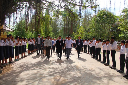 代表团一行首先参观了吴哥高中孔子课堂,暹粒省教育厅萨布萨卡副主任代表教育厅为到访嘉宾佩戴吉祥“水布”,表达欢迎之情、祝福之意。