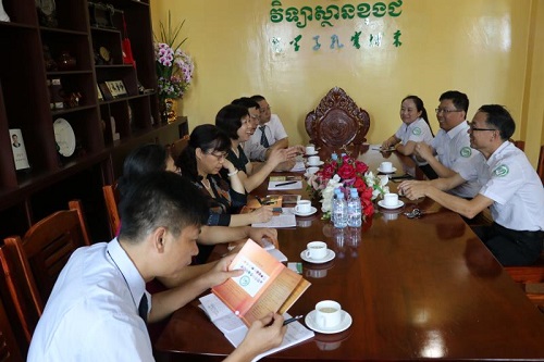 宾主双方在会议室进行了友好会谈。谢莫尼勒院长和夏修龙院长介绍了孔子学院的发展和办学情况,柬埔寨孔子学院成立近8年来,在中柬双方政府和民众的大力支持下,从无到有,从小到大,从弱到强,已发展成为柬埔寨汉语教育和文化交流的知名品牌。客人还观看了介绍柬埔寨孔子学院的视频。