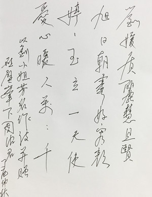9月4日,一位来自开发区学校的退休教师周治君送来两首藏头诗,巧妙地将临床医学院/附属医院内分泌科的许仁炜医生和刘旭婷护士的名字藏在了诗句的开头,以他们为缩影,感谢内分泌科的医护人员在他住院期间给予的关心和照顾。