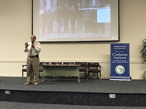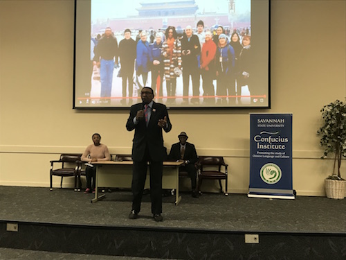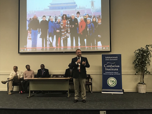 当地时间10月26日,美国萨凡纳州立大学孔子学院以“外国人讲中国故事”的方式在大学礼堂举行了一场主题为 “内视中国”的专题讨论会。孔子学院特邀今年三月赴华访问教育团的部分成员:萨凡纳州立大学副校长兼国际交流处处长伊曼纽尔(Dr. Emmanuel)、萨凡纳州立大学工程技术教育系助理教授基尚(Dr. Kisha)、萨凡纳州立大学人文艺术学院政治系教授贝赫鲁茲(Dr. Behrouz)、萨凡纳市公立中学联盟课程指导办公室主任马克·林斯基(Dr. Linsky)以及上海-美国进出口贸易有限公司顾问弗雷泽(William Frazier)作为此次讨论会的嘉宾。近百名萨凡纳州立大学在校师生前来参加了此次讨论。