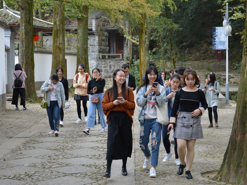 时值深秋,书院内沉厚古朴的石木建筑掩映在微凉的绿意当中,静谧而神圣,国学班师生的到来,更赋予了这座古老的文教圣地活泼现代的韵味。