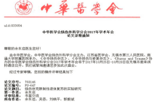 会上,各位院士、教授针对休克复苏策略与危重烧伤面临的困境、各种难愈性创面的修复、烧伤脓毒症研究主要方向及其进展、电损伤早期血管修复重建进展、瘢痕的早期防治及烟雾吸入性损伤的分子机制及靶向治疗进行了专题报告,夏照帆院士作了《基于 HQMS 数据库的中国烧伤现状 2017年报告》,临床医学院/附属医院余东启医师的论文《烧伤休克限制性液体复苏的实验研究》被大会录用。