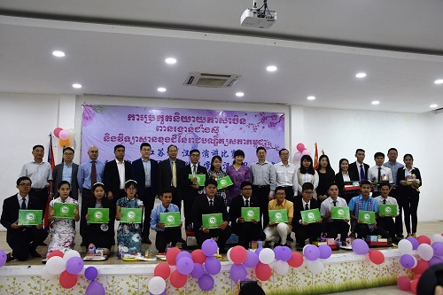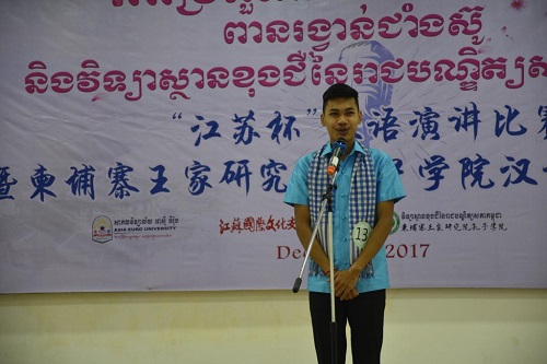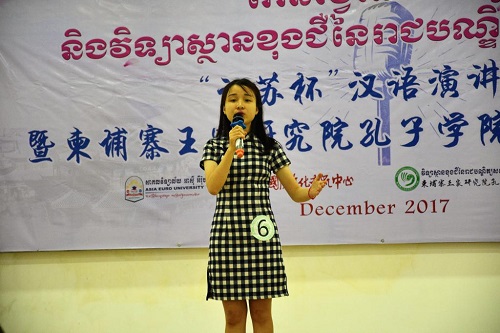12月19日上午,第七届“江苏杯”汉语演讲比赛暨柬埔寨王家研究院孔子学院汉语风采大赛决赛在金边亚欧大学金色大楼13楼会议厅举行。本次比赛由江苏国际文化交流中心、柬埔寨王家研究院孔子学院和南京大学共同主办,柬埔寨王家研究院孔子学院亚欧大学中文系承办。中国驻柬埔寨大使馆参赞李杰、柬埔寨王家研究院副院长宋春文(Sum Chhumbun)、江苏国际文化交流中心秘书长刘翎、亚欧大学校长谢索皮博士(Chea Sopheap)、南京大学海外教育学院教授程爱民、柬埔寨王家研究院孔子学院中方院长夏修龙、柬方院长苏碧娜(Vuth Sophakna)出席决赛现场,亚欧大学中文系师生、金边皇家大学中文系师生及柬埔寨社会人士等300余人观看了比赛。