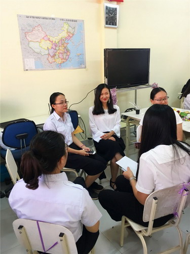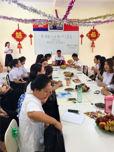 来自孔院和华校的志愿者教师分别针对自己的教学工作提出了在日常教学中遇到的问题,从课堂管理、文化活动和教学方法方面进行分析。随后进行了分组讨论,每一位老师积极参与讨论,并且提出了不少建设性的意见和建议,如孔院志愿者教师郝丹丹提出了进行中柬文化对比的方法;华校志愿者教师李熠晨则针对课堂管理提出了“三步走”的解决方案。教师们相互讨论、学习和沟通,现场气氛十分热烈。