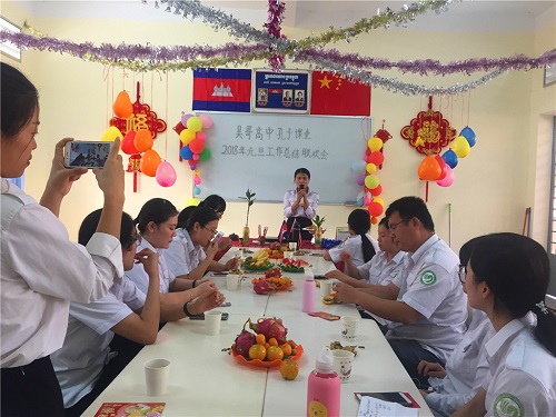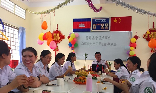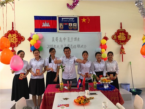 2017年12月28日,柬埔寨王家研究院孔子学院吴哥高中孔子课堂举办了2018年元旦工作总结和联欢会,孔子课堂负责人刘振和全体志愿者教师参加了此次活动。