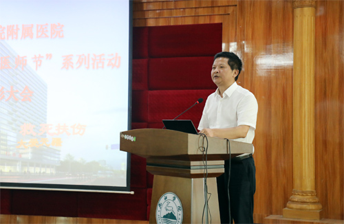 党委书记张南华代表全院医师,向一直以来关心支持临床医学院/附属医院医疗卫生工作的社会各界人士,以及关爱和帮助医务人员的家属们表示衷心的感谢。张书记说,今年我院召开首个“中国医师节”表彰大会,是对既往工作的总结,也是未来新篇章的起点。我院的医师队伍中,优秀人才远远不止受表彰的这些,当中有年过半百仍老当益壮坚持战斗在临床一线的老专家、老同志;有年富力强、承前启后、勇挑重担的中青年砥柱;还有雏燕展翅、跃跃欲试、斩露头角的杏林春苗。你们中有许多令人感动的先进事迹:你们顽强拼搏,不断进取,对技术精益求精;你们爱岗敬业,无私奉献,视病人的利益高于一切;你们廉洁自律,视病人如亲人,将高超医术与高尚医德完美结合。希望全院各级医师切实增强自身的责任感和使命感,以崭新的姿态、饱满的热情,继续齐心协力,奋勇向前,为医院的不断发展强大做出更大的贡献!