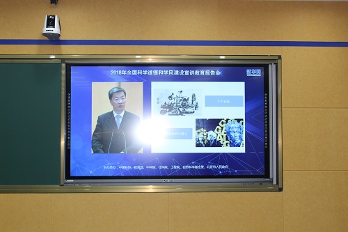 10月15日下午,外国语学院在香远楼外语教学情景中心417室组织教师收看在人民大会堂主会场举办的2018年全国科学道德和学风建设宣讲教育报告会。学院领导韩琨、杨杰、周志高等和教师、学生代表集中收看直播。