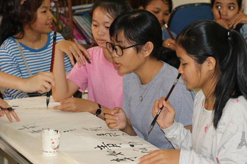 10月13日,暹粒吴哥高中孔子课堂开展了以“翰墨书香”为主题的书法体验活动。周春容老师对中国书法的发展与演变进行了讲解,并向学生们展示了王羲之、柳公权、颜真卿等几位书法名家及其代表作品。曾一舫老师给学生介绍了毛笔的构成,笔尖、笔腹的位置及其在书写过程中所起到的作用,并教授了学生们正确的握笔姿势和一些基本笔画的写法。学生们对于中国书法都很感兴趣,一笔一划地学写毛笔字。其间,蔡尚益老师、赵静老师和叶鑫老师对学生给予耐心示范和指导。