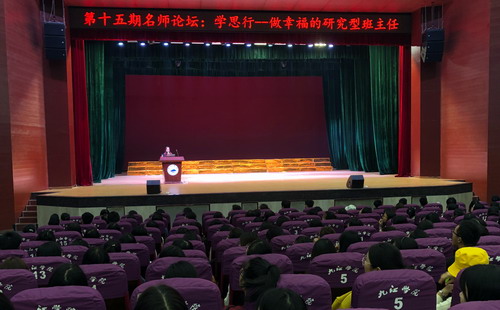 10月24日下午,学校在大礼堂举行了第十五期名师论坛活动。邀请了九江小学德育处主任、特高级教师钱琪老师做了“学思行——做幸福的研究型班主任”专题讲座,20多名师范教育类课程授课教师及700余名师范类专业学生聆听了讲座,讲座由教务处漆晗东副处长主持。