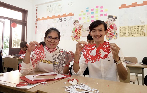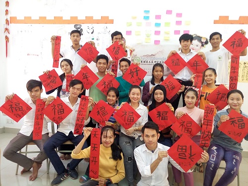 柬埔寨皇家科学院孔子学院韩桑林大学汉语中心举办“写福字 剪窗花 庆新年”活动