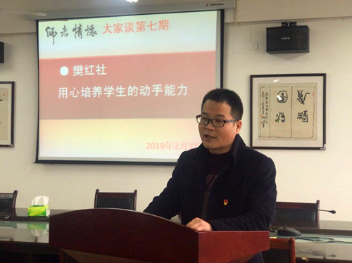 樊红社老师讲述的题目是:《用心培养学生的动手能力》,他利用这次机会阐述了工科教育以及应用型人才培养的重要理念和教学工作的侧重点,具有很强的针对性和示范性,也符合我们九江学院的人才培养定位。他分了3个部分进行阐述:第一,督促学生熟悉常用仪器,学会正确使用;第二,引导学生重视信息技术,掌握一门软件技能;第三、鼓励学生利用开放平台,尝试创新设计。他说:使用仪器是工科学生实验的基础和根本,实验需要通过仪器设备采集第一手数据,只有完整、准确的数据才能更好地分析、总结、验证理论知识。从职业要求来看,熟练使用仪器设备是动手的第一步动作,是可不可以动手的前提,是工科一切专业活动的底线和平台。在这个基础上,樊红社老师致力于“引导学生重视信息技术,掌握一门软件技能”,为此付出了很多心血,也获得了一定的成效。有的学生毕业以后就因为这个原因而在事业上得心应手,风生水起,成为一个具有社会竞争力的人才。樊红社老师最后一段话很好地做了一次师者情怀的诠释:学生动手能力的提高不是一朝一夕的事情,需要我们课里课外循序渐进地教导,一点一滴地指导,不厌其烦地督导。要做到这些,需要我们心甘情愿地付出超出课时的心血!