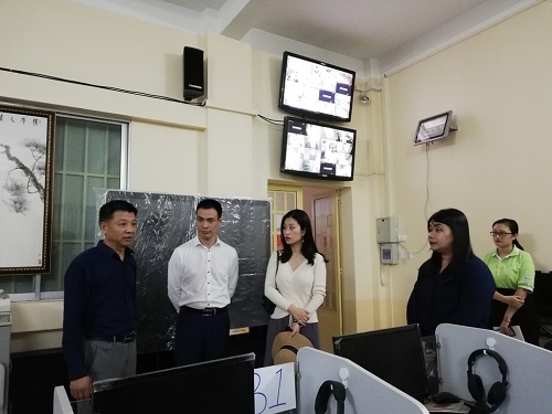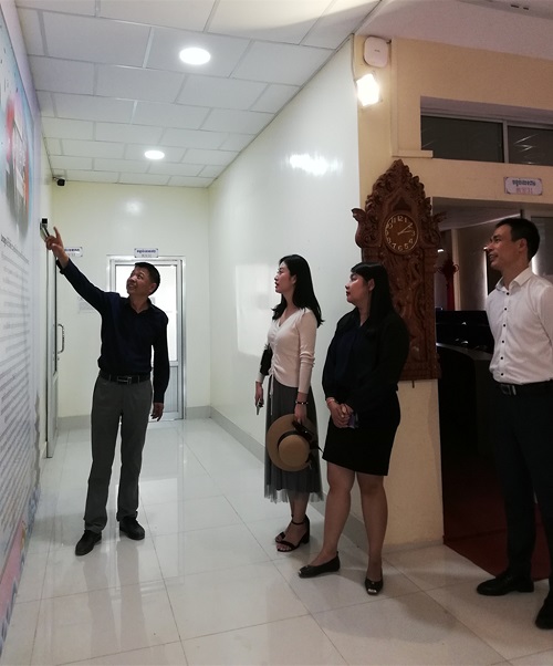柴克清院长和苏碧娜院长首先对冯自权主任一行人的到访表示欢迎,并带领冯主任二人参观了柬埔寨皇家科学院孔子学院本部芳华大楼,介绍了柬埔寨皇家科学院孔子学院的发展历程和教学设施的配备、大小活动的开展等汉语教学和文化交流方面的工作。