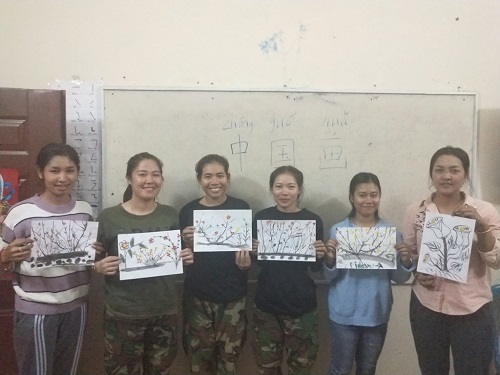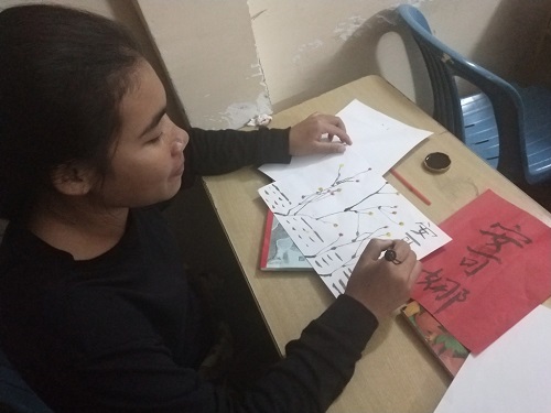 拿到纸笔,学生们都跃跃欲试,有的同学会简单的调色,甚至会自己设计新图案。比赛中大多数学生都画了梅花,学生们说,他们学过“遥知不是雪,为有暗香来”“梅花香自苦寒来”等有关梅花的诗词,柬埔寨没有冬天,他们都很想看看雪,所以都很喜欢中国的梅花。