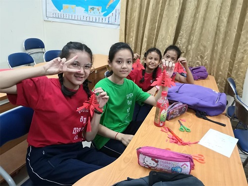 中华文化活动一定少不了剪纸课,文亚老师带领初级C班上了一节异彩纷呈的手工剪纸课。一张普通的红纸在老师的巧手中很快成了一个立体的春字,学生们都被魔术般的变换震撼了,急切的想知道每一步该怎么剪,“老师,你慢一点儿!”“老师,这个怎么弄?帮帮我。”二十多个人的课堂到后来三个老师都忙不过来。钟慧琪老师举着第一个学生的作品兴奋的跟其他老师一起分享。透过剪纸的镂空,看到了最美的的笑容。