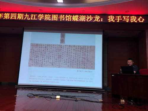 为诵读名家经典,交流求学、治学、品书的经验,营造浓郁的校园文化氛围,5月23日晚,校图书馆特邀江西省书法家协会副主席曹端阳先生和我校首届师德师风标兵吴若飞老师做客2019年第四期“蝶湖沙龙”,在逸夫图书馆报告厅为我校师生带来了一场主题为“我手写我心”的公益讲座。师生代表及校外文学书法爱好者约300多人聆听了讲座,现场座无虚席。图书馆谢艳老师及嘉宾吴若飞老师共同主持了讲座。