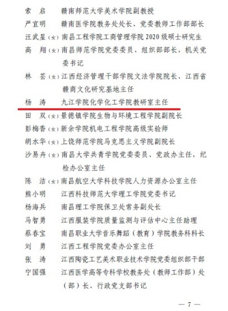 近日,中共江西省委教育工委授予了100名同志为“全省教育系统优秀共产党员”荣誉称号。其中,江西省“千人计划”——科技创新高端人才项目入选者、我校化学化工学院杨涛同志被授予“全省教育系统优秀共产党员”称号,同时,他还被授予了九江市2021年“市直单位优秀共产党员”称号。