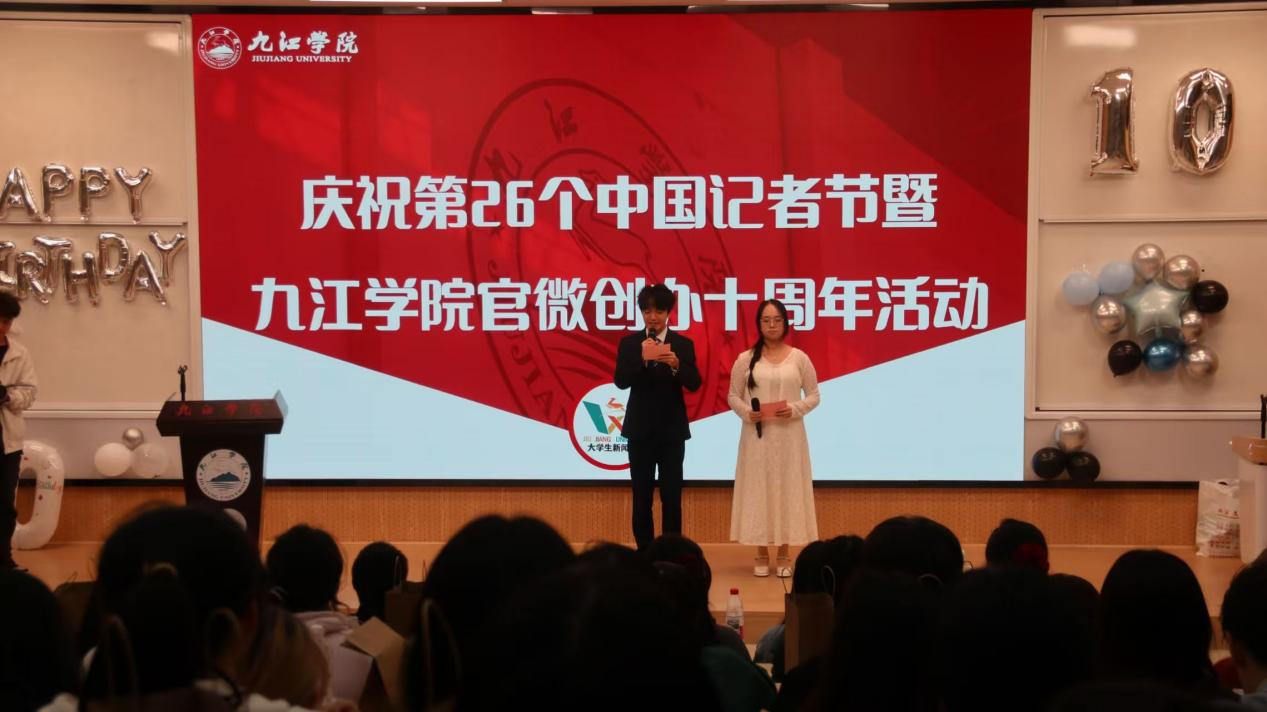 11月8日晚,学校在竞知楼阶梯教室2举行第26个中国记者节庆祝活动暨九江学院官方微信创办十周年纪念活动。校党委委员、宣传部部长刘平出席活动并为记者节采风大赛获奖学生颁奖。大学生新闻中心指导老师、新闻中心全体成员、校团委新媒体发展中心、各二级学院新媒体宣传骨干,以及江西职业技术大学、九江职业大学、江西财经职业学院等兄弟院校师生代表,共计200余人齐聚一堂,共襄盛会。